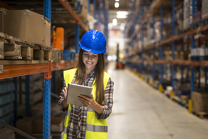 Warehouse female worker checking inventory on digital tablet in large distribution warehouse storage area.